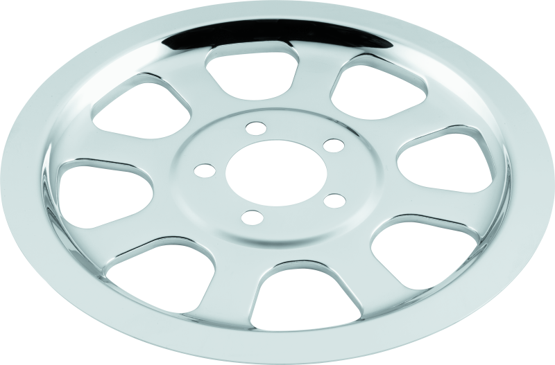 Chrome-plated, precision-formed steel insert with eight-hole pattern dresses up rear wheel belt pulley.