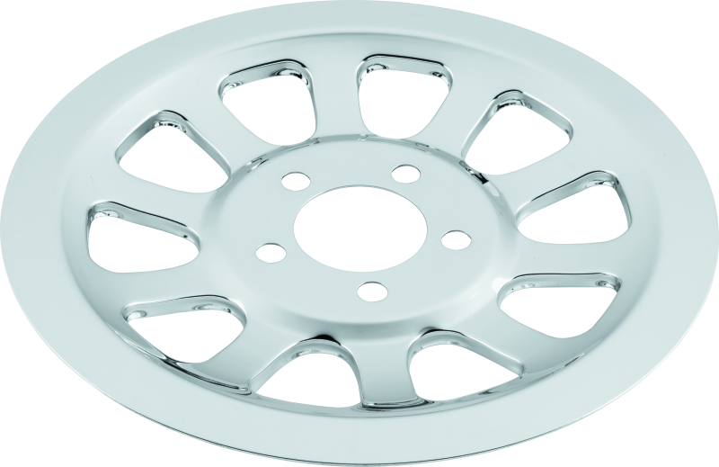 Chrome-plated, precision-formed steel insert with eight-hole pattern dresses up rear wheel belt pulley.