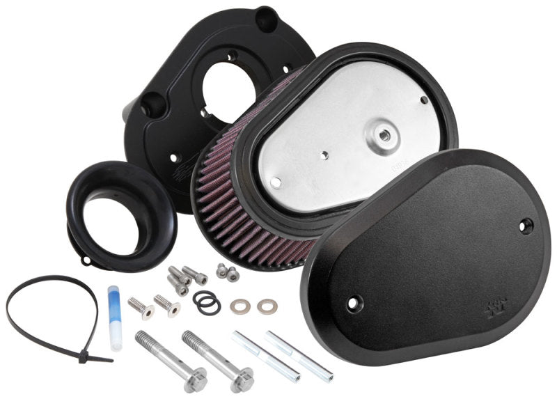 K&N's Street Metal Series High-Flow Air Intake Systems provide a good looking appearance, offer increased airflow and deliver more horsepower & torque to your Harley-Davidson motorcycle. These intake systems increase power by eliminating the stock OE air cleaner which is replaced by a complete high-flow K&N air intake system. This air intake system is constructed with an extra tall K&N air filter providing more air flow and longer service intervals than standard RK-series air intake filters. The extra tall air filter design is intended to be used on larger or custom engine builds that would benefit from higher levels of air flow. Installation is simple with a sturdy, custom aluminum backing plate that mounts directly to the throttle body via an aluminum integrated, internal-run breather system. A durable mounting gasket is also included to help absorb vibration. The K&N high-flow air filter is washable, reusable, pre-oiled and ready for installation. Simple designed custom covers give this air intake good looks while powering down the highway or at your local show.