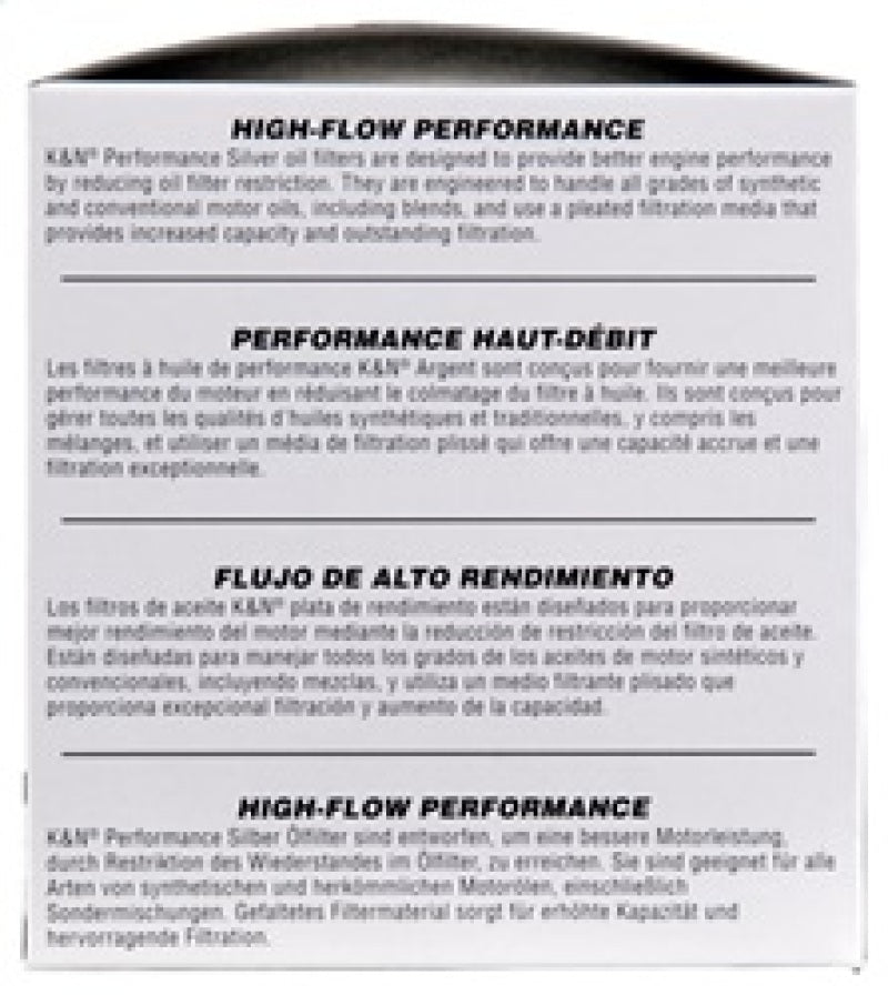 K&N Performance Silver Oil Filters have been specially designed for professional installers and service providers. Their high flow design can help to improve engine performance by reducing oil filter restriction. Our Performance Silver Oil Filters have a fluted canister shape so they can be removed with a traditional oil filter wrench commonly available to commercial installers. These Performance Silver oil filters provide outstanding filtration and engine protection throughout their service life. They are engineered to handle all grades of synthetic, conventional and blended motor oils. The pleated media provides high capacity making them suitable for extended oil change intervals when used in accordance with the vehicle and motor oil manufacturers recommendation. K&N Performance Silver Oil Filters are available for canister and cartridge type oil filter applications.