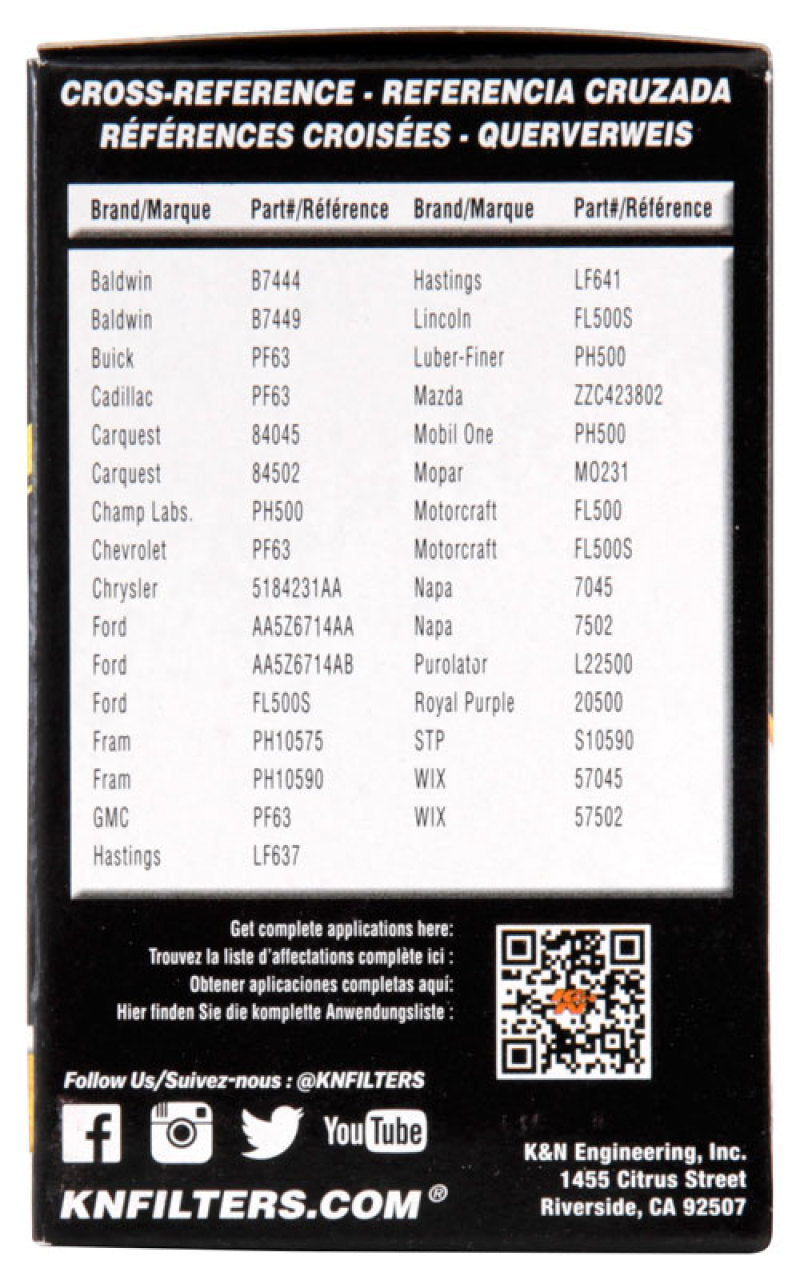 K&N premium oil filters are meticulously engineered to offer outstanding filtration and engine protection. Designed to operate with all synthetic, conventional, and blended motor oils, K&N's pleated synthetic-blend filtration media helps to shield your engine from contaminants and ensure a consistent flow of oil. The heavy-duty canister is engineered to be exceptionally durable, and a one-inch welded hex nut can be used for quick and easy filter removal. Each filter is specifically designed to withstand the service intervals recommended by vehicle manufacturers, and is protected by the K&N 1-Year Limited Warranty.