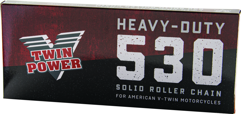 Twin Power™Drive Chain for American V-Twins. High-tensile steel, solid rollers and oversize pins ensure longer life and higher strength. The 530 Heavy-Duty is a perfect replacement chain for classic V-Twins with an average tensile strength 7,700 lbs. Includes clip style master link with a natural finish. 530 Z-ring provides the ultimate strength for all performance applications with an average tensile strength of 11,200 lbs. Includes rivet style master link with a gold finish.