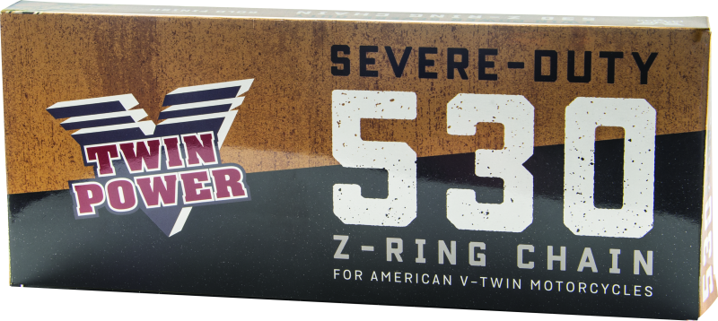 Twin Power™Drive Chain for American V-Twins. High-tensile steel, solid rollers and oversize pins ensure longer life and higher strength. The 530 Heavy-Duty is a perfect replacement chain for classic V-Twins with an average tensile strength 7,700 lbs. Includes clip style master link with a natural finish. 530 Z-ring provides the ultimate strength for all performance applications with an average tensile strength of 11,200 lbs. Includes rivet style master link with a gold finish.